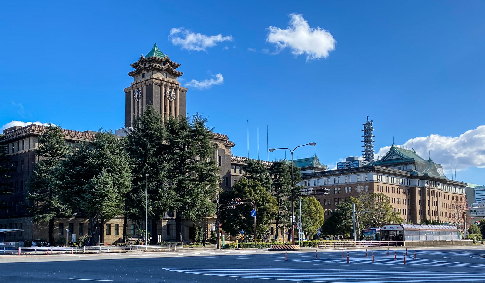 Απέναντι από το Κάστρο της Ναγκόγια βρίσκονται δύο κτίρια με μια αρχιτεκτονική τεχνοτροπία που ήταν αρκετά διαδεδομένη στις αρχές της περιόδου Σόουα, τη δεκαετία του 1930. Είναι η τεχνοτροπία του Αυτοκρατορικού Στέμματος (帝冠様式, τέικαν γιόσικι), μια μίξη ιαπωνικής και δυτικής αρχιτεκτονικής με τις χαρακτηρικές ιαπωνικές σκεπές σε κτίρια δυτικού τύπου από οπλισμένο σκυρόδεμα. Αναπτύχθηκε την περίοδο ανόδου του ιαπωνικού μιλιταρισμού που προσπαθούσε να περιορίσει την επιρροή του μοντερνισμού και των δυτικών τεχνοτροπιών σε κεντρικά κτίρια και έργα υποδομής.